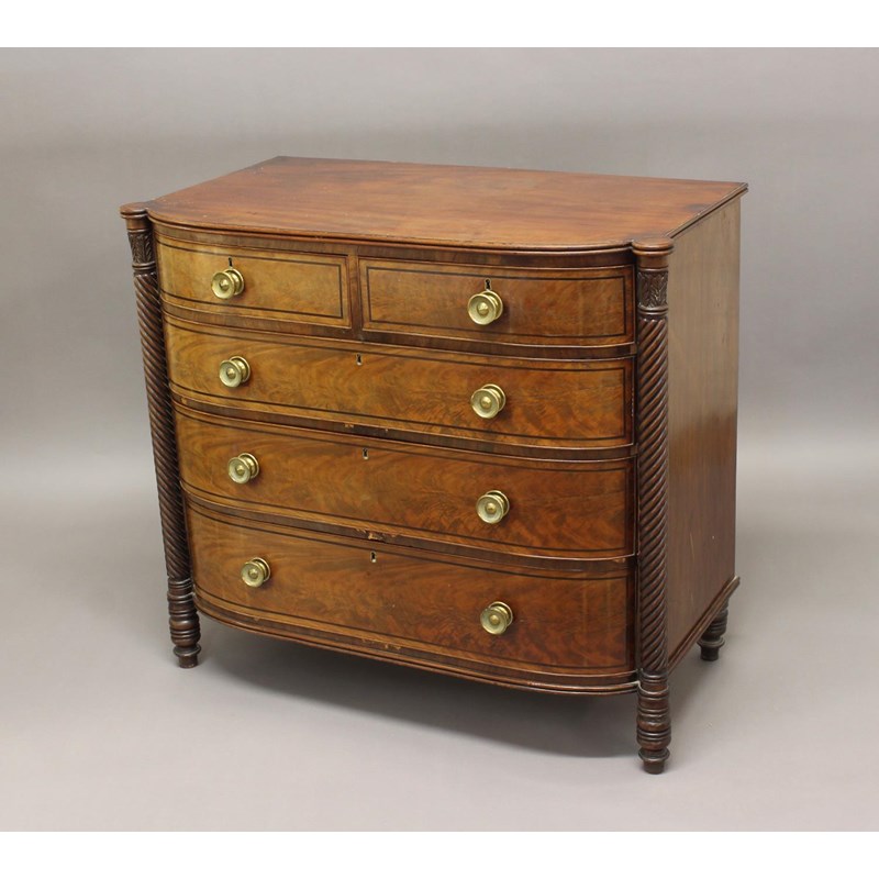 A REGENCY MAHOGANY BOW FRONTED CHEST OF DRAWERS, the shaped top above an arrangement of two short and three long drawers flanked by twist and leaf carved columns, on turned supports, height 94cm, width 105cm, depth 56cm