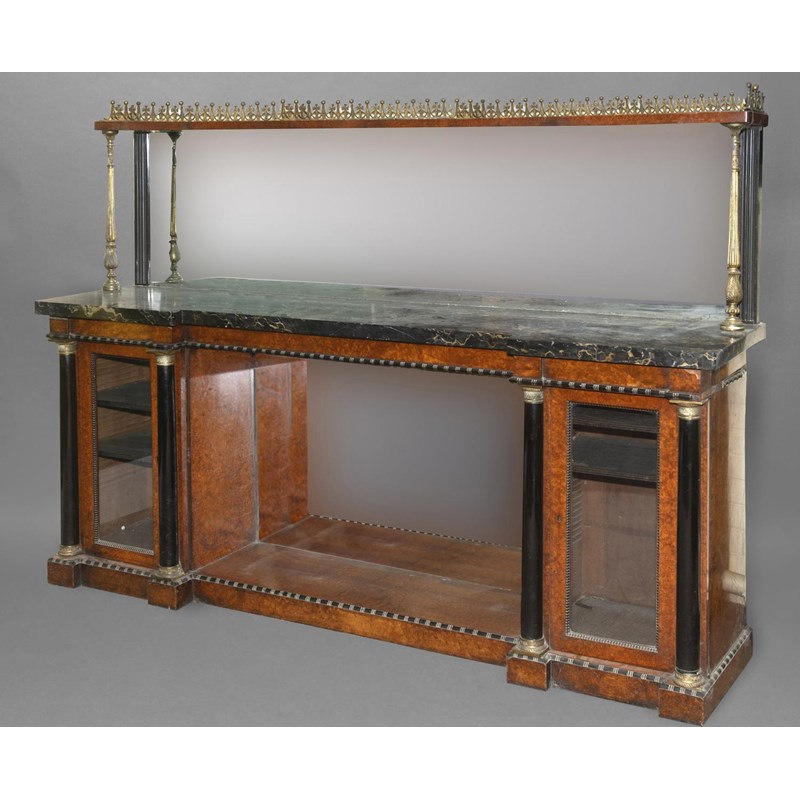 The veined black marble top with inverted break front beneath a broad rectangular mirror, amboyna veneered shelf with gilt gallery, on gilt uprights. The base with a central mirror backed recess between glazed cupboard doors flanked by ebonised columns, on a platform base with moulded edges, 157cm high, 214cm wide and 51cm deep.