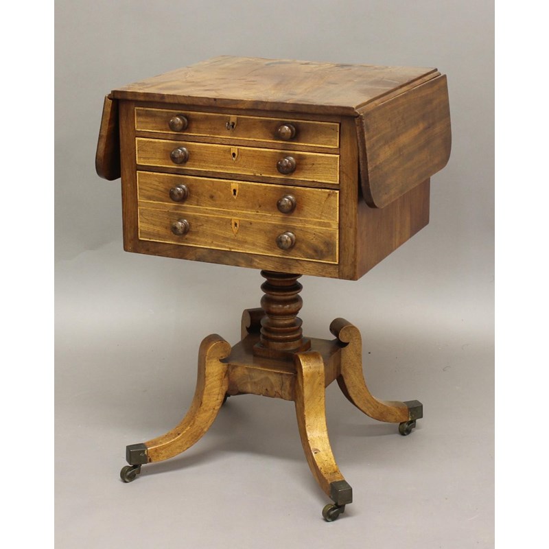 A 19TH CENTURY MAHOGANY WORK TABLE, the drop flap top above an arrangement of three drawers on a turned, knopped column and quadripartite base, height 73cm, maximum width 78cm, depth 43cm