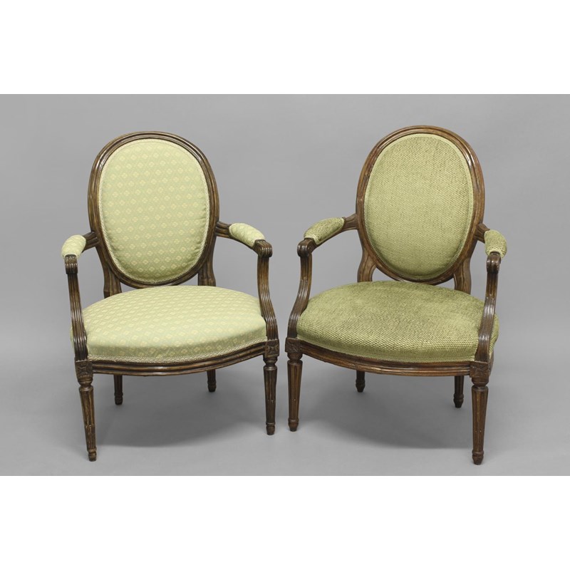 Two similar French Provincial armchairs with stained beech frames with oval upholstered backs, arm rests and seats on a moulded frame and tapering stop fluted legs.