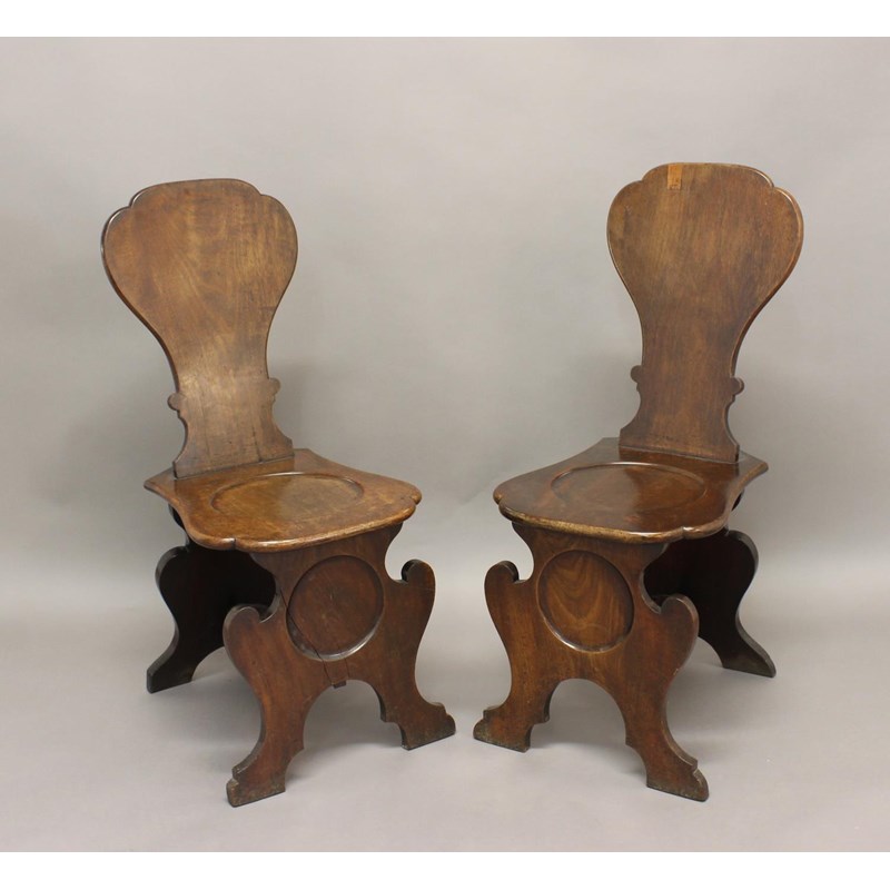 A PAIR OF 18TH CENTURY DUTCH HALL CHAIRS. A pair of mahogany hall chairs with shaped seats with circular dished centres, the front leg similarly decorated, with tall waisted backs. 98cm high, 41cm wide and 51cm deep.