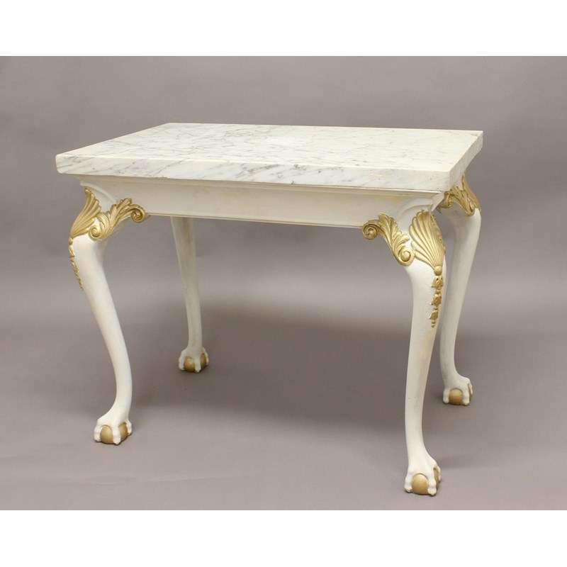 A MARBLE TOPPED CONSOLE TABLE, 20th century, the painted base with gilt detailing on ball and claw feet, 81cm high, 98cm wide, 58cm deep