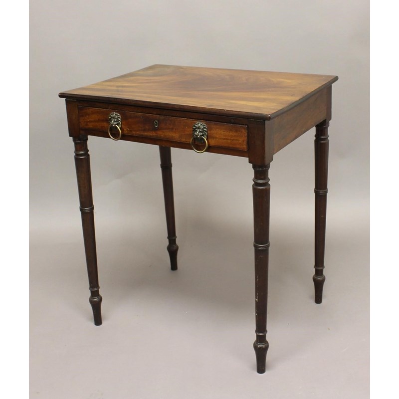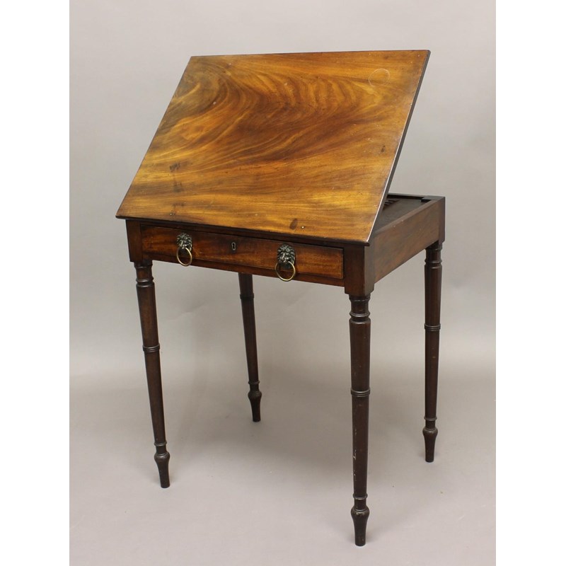 early 19th century, the easel top above single drawer with lion mask handles on turned supports, height 76cm, width 66cm, depth 49cm