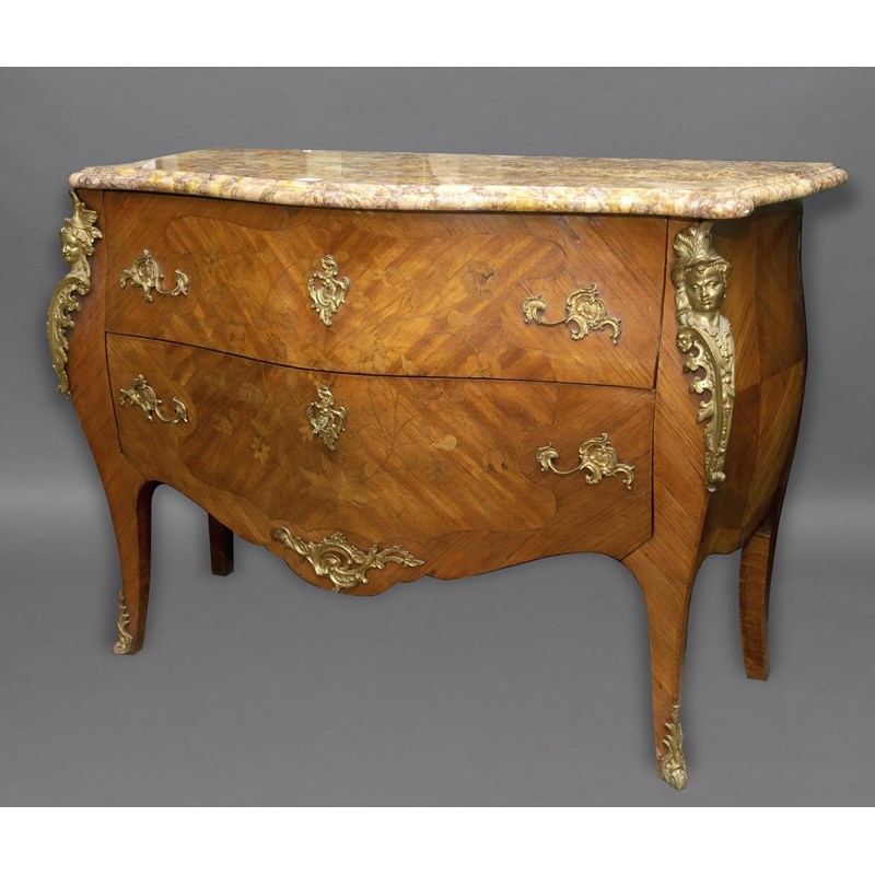 The variegated marble top with serpentine front and moulded border above two bow fronted drawers with all over scrolling foliate marquetry, the corners with gilt metal mounts, with conforming handles, key escutcheons and feet, 87cm high, 118cm wide and 47cm deep.