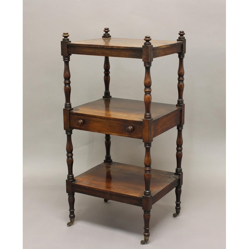 A 19TH CENTURY ROSEWOOD THREE TIER WHATNOT, on turned supports with single drawer, 100cm high, 47cm wide, 38cm deep