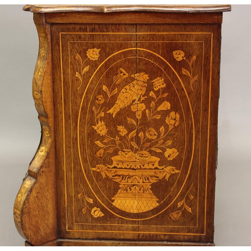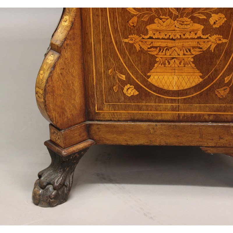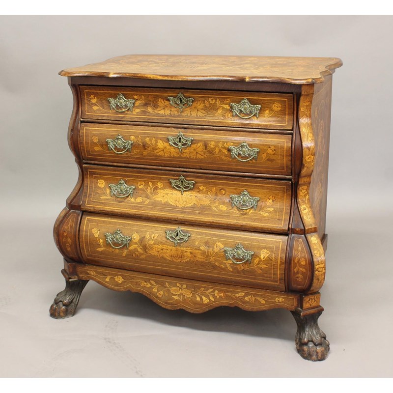 A DUTCH MARQUETRY BOMBÉ CHEST OF DRAWERS, the shaped rectangular top above four drawers with swag handles and mounts on lion's paw feet, the whole inlaid with flowers, vines and birds, height 88cm, width 90cm, depth 54cm
