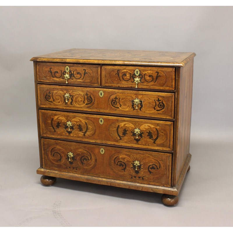 AN 18TH CENTURY WALNUT MARQUETRY CHEST OF DRAWERS,