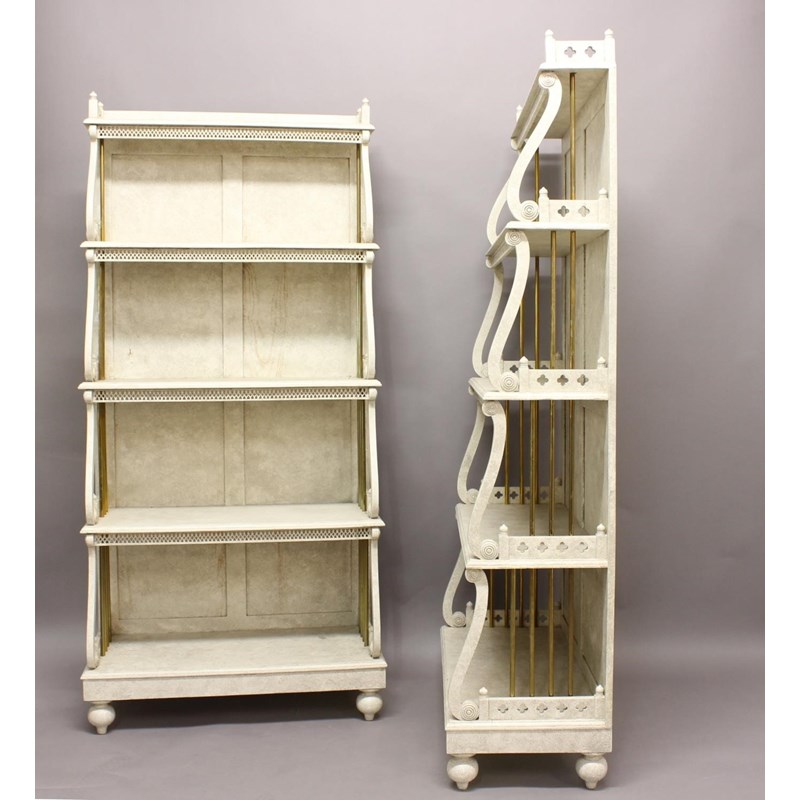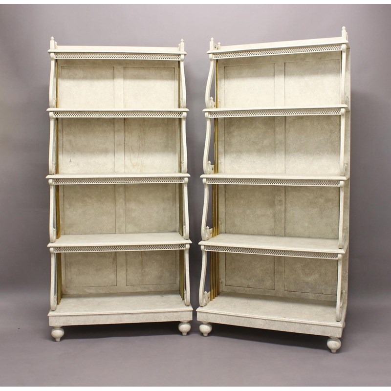 A PAIR OF WATERFALL OPEN BOOKSHELVES, 20th century, the five shelves on scrolling supports with brass struts, height 194cm, width 90cm, depth 43cm (2)