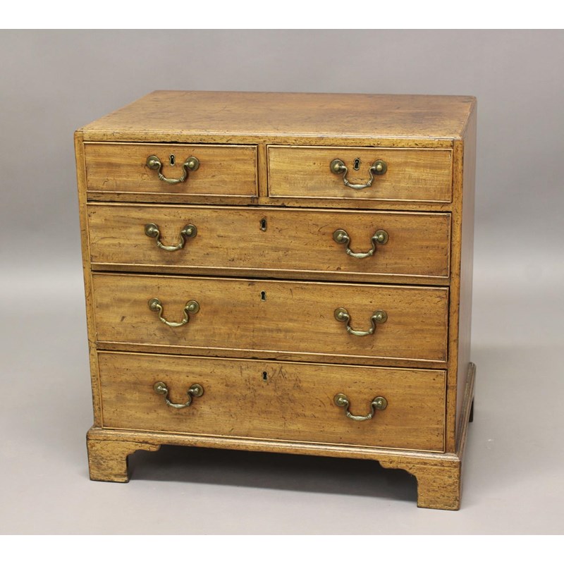 The chest with a rectangular caddy moulded top above two short and three long graduated drawers, with brass handles, on bracket feet, 76cm high the top 76 x 50cm.