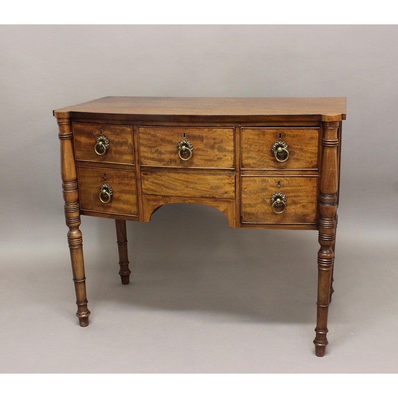 A bow fronted mahogany sideboard with a shaped top on pillar fronted supports with an arrangement of a single deep and four further drawers, with brass handles with foliate back plates, on turned legs, 92cm high, the top 112 x 56 cm.