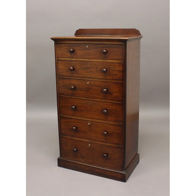 A Victorian mahogany collectors chest or narrow chest of drawers with a rectangular top with moulded border above six drawers with turned knob handles, on plinth base, 112cm high, the top 61cm x 35.5cm.