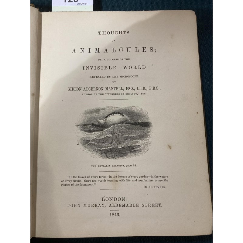 Mantell, Gideon Algernon. Thoughts on Animalcules; or, A Glimpse of the Invisible World Revealed by the Microscope, first edition, half-title, 12 coloured plates, 8 pages of publisher's advertisements at end, original publisher's cloth, faded, spine slightly chipped at ends, 8vo, London: John Murray, 1846