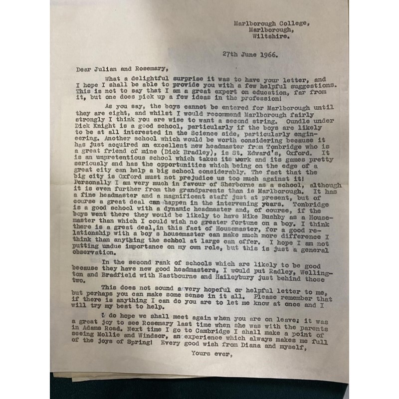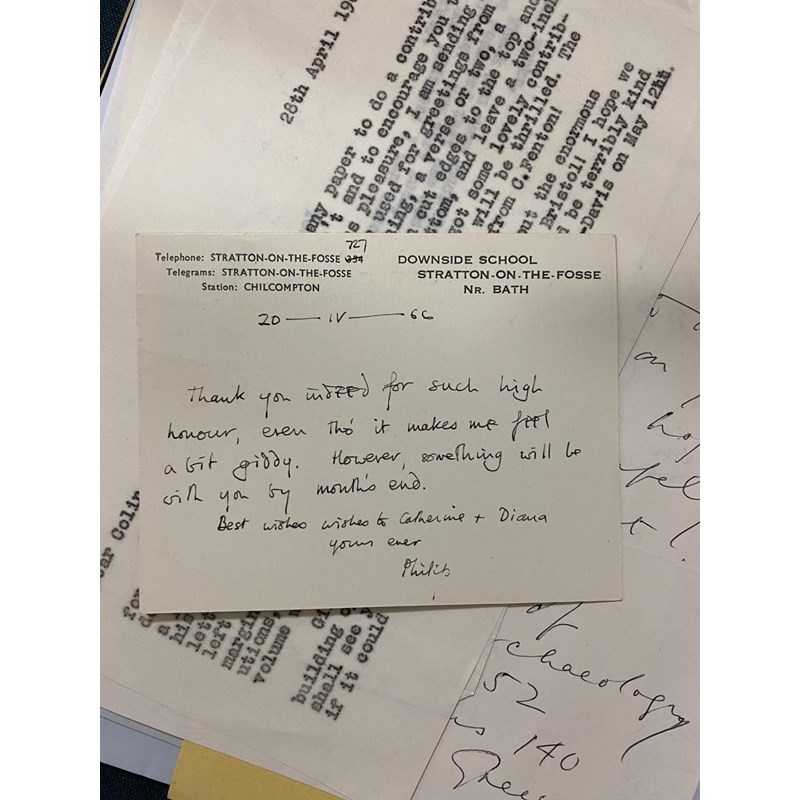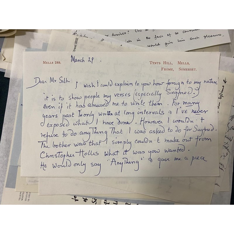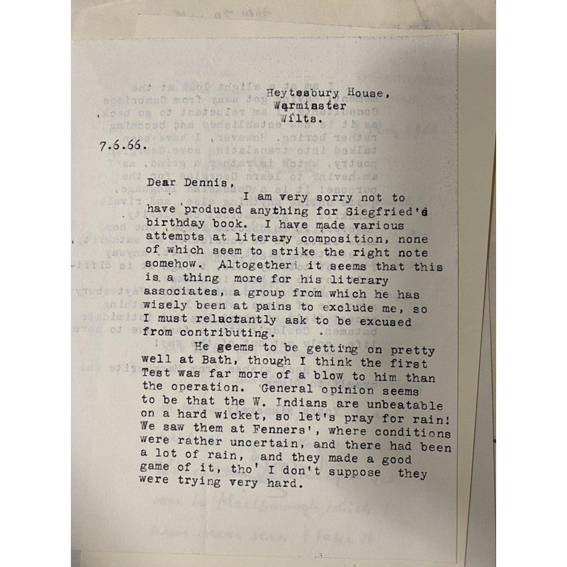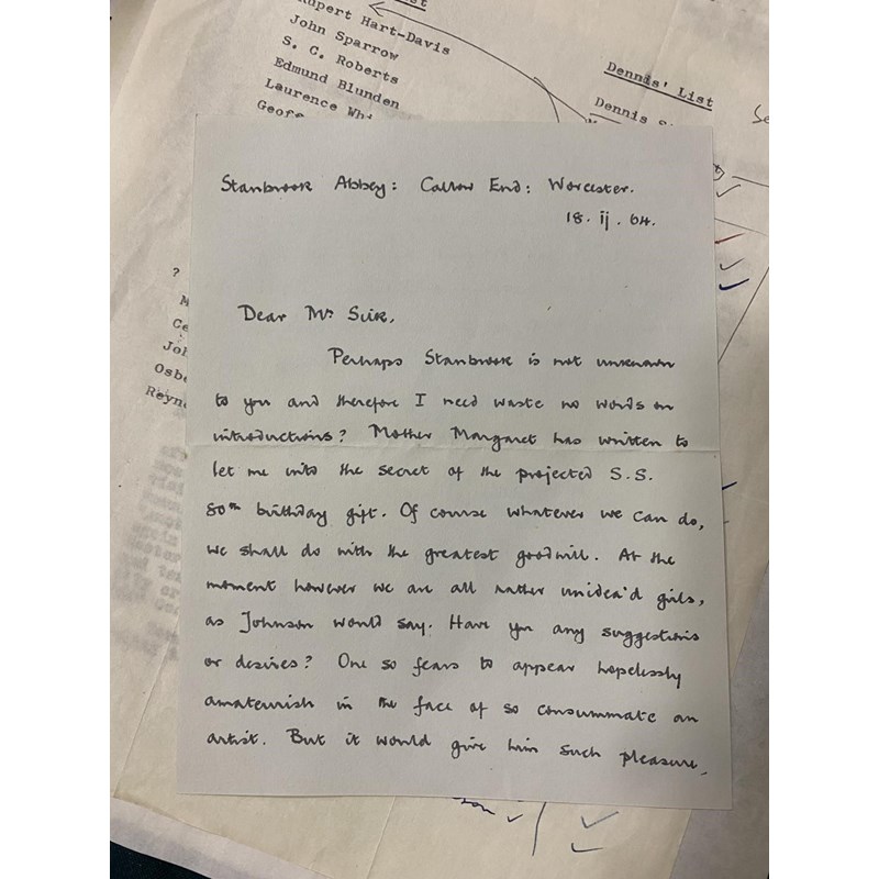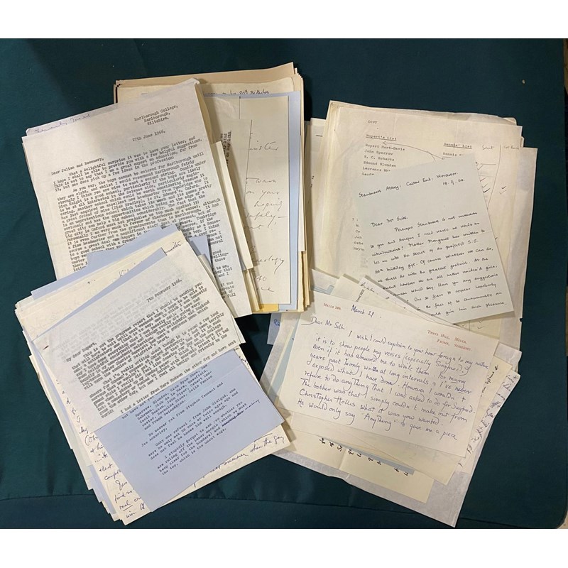 Sassoon, Siegfried. A collection of correspondence relating to the tribute volume compiled by Rupert Hart-Davis and Dennis Silk for SS's 80th birthday, 1965-66. With letters between the compilers on progress with the volume, and from those invited to contribute, including Haro Hodson, Dame Felicitas Corrigan, Mother Margaret Mary, Dom Martin Salmon, George and Hester Sassoon, Monsignor Gilbey, Katharine Asquith, Christopher Hollis and Colin Fenton. Also draft of a letter from Dennis Silk to SS describing their first meeting at a cricket match in May 1953; ALS from Edmund Blunden to SS ; carbon copies of Dennis Silk's letters and photocopies of a number of the contributions. The manuscript contributions (all written out on the same paper) were bound into a single volume by Sangorski & Sutcliffe. This volume was sold at Sothebys on 17th December 2008 for £17,000.