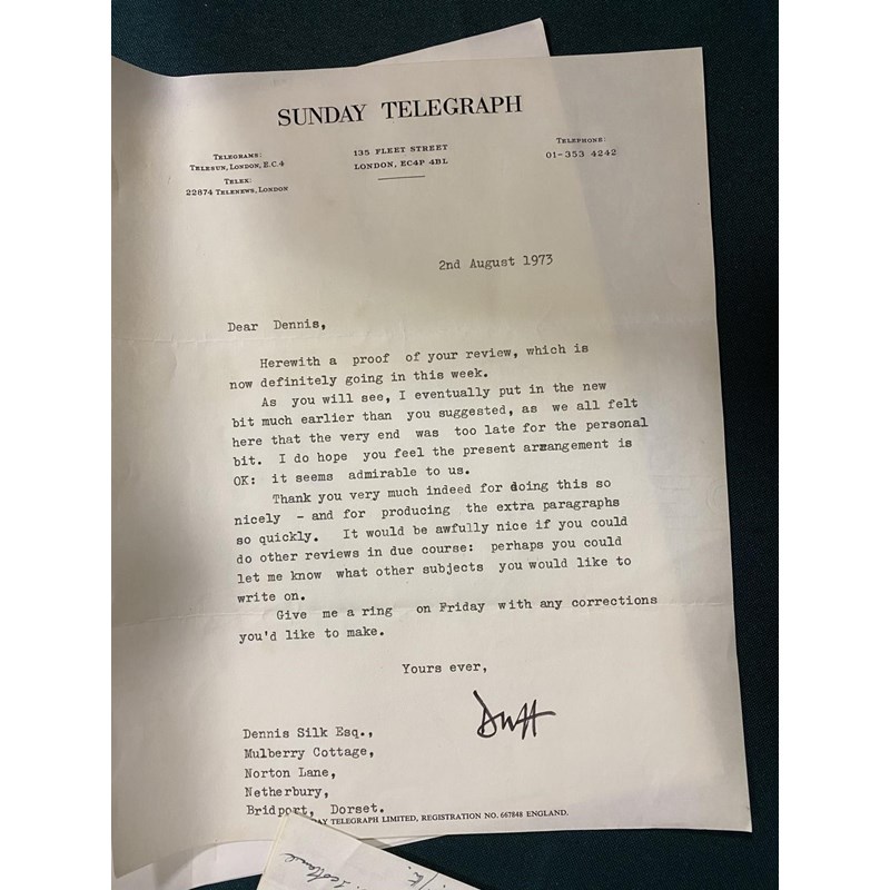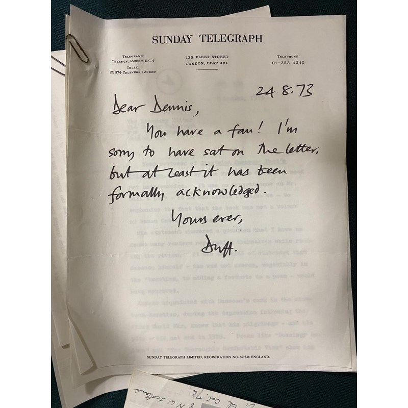 Sassoon makes a reference to the same BBC letter on p. 84 of Poet's Pilgrimage, 1973, a copy of which is included in the lot, along with various correspondence concerning Dennis Silk's review of the same, including 2 ALsS from Dame Felicitas Corrigan, who assembled and published the work at Stanbrook Abbey.