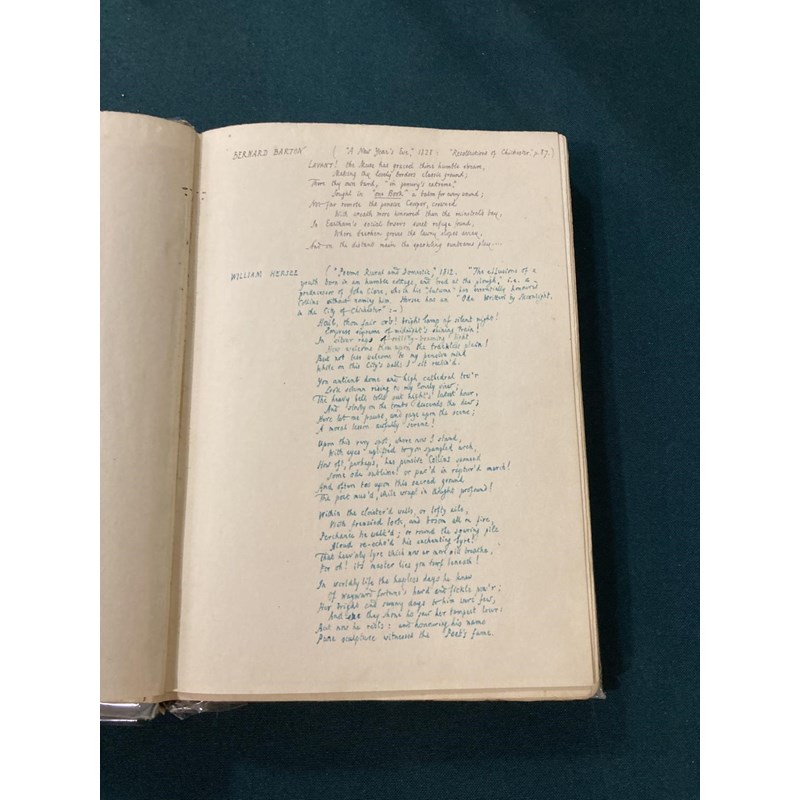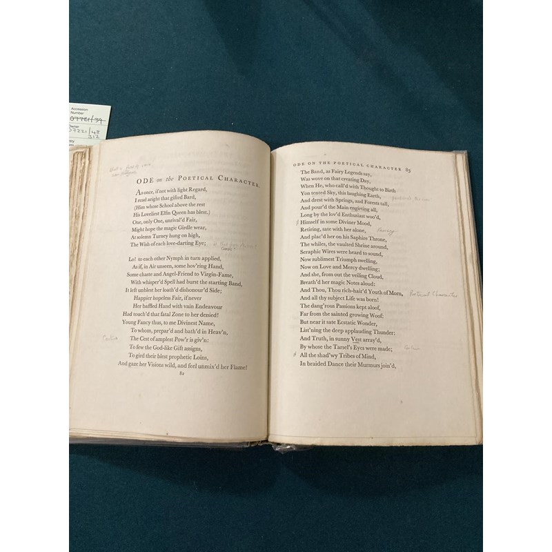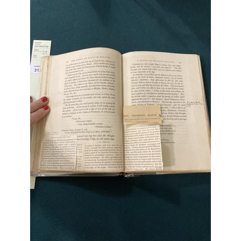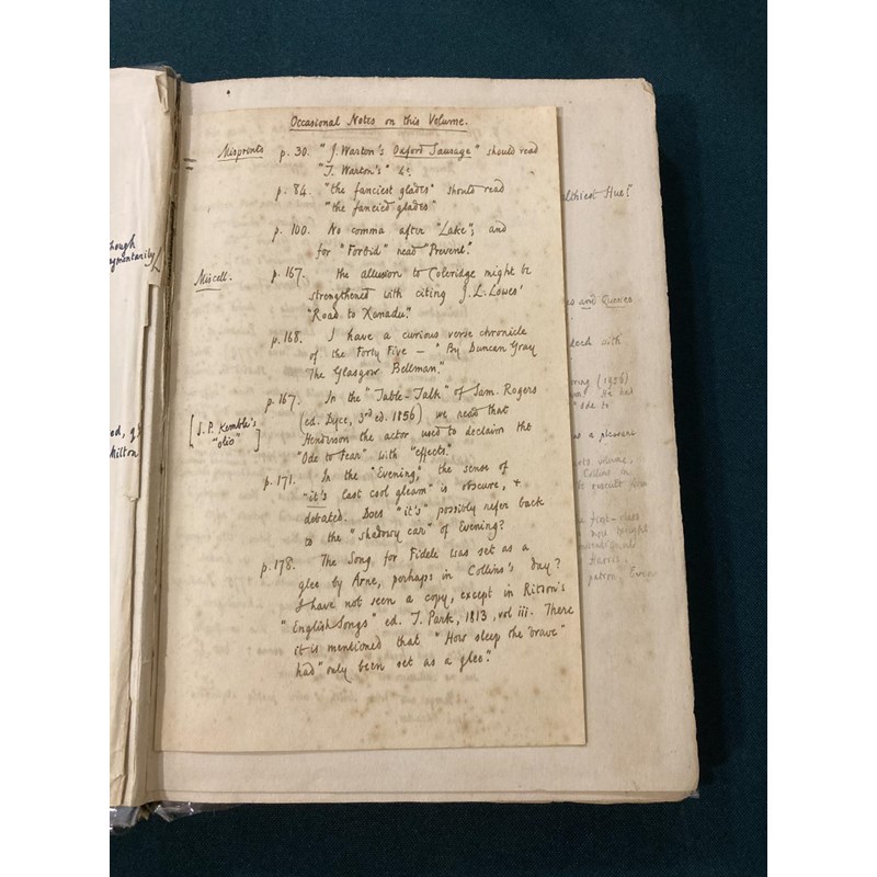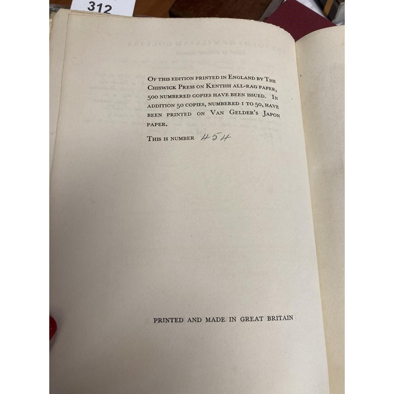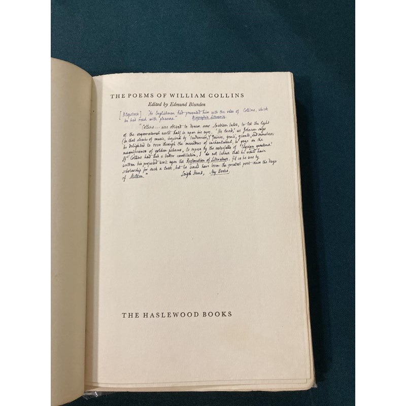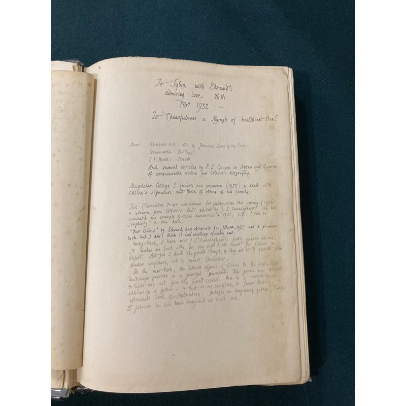 Collins, William. The Poems…edited…by Edmund Blunden, number 454 of 500 copies, portrait frontispiece, original boards, wear to spine, inscribed "To Sylva with Edmund's admiring love, 26th Feby. 1932", and on verso of upper cover, "This book should be restored to Sylva when the right moment occurs, E. (She has expressed a wish for it)", copious pages of manuscript notes by Blunden on Collins, copies of poems, etc. tipped in, and annotations in the text, 8vo, London: Frederick Etchells & Hugh Macdonald, 1929