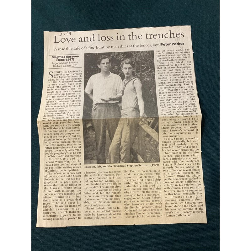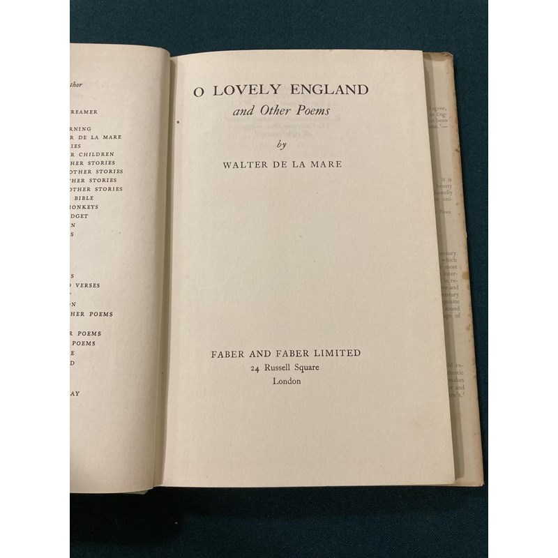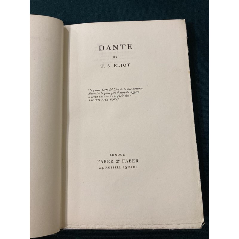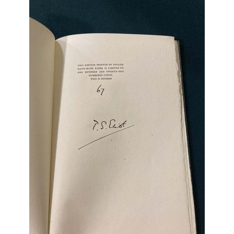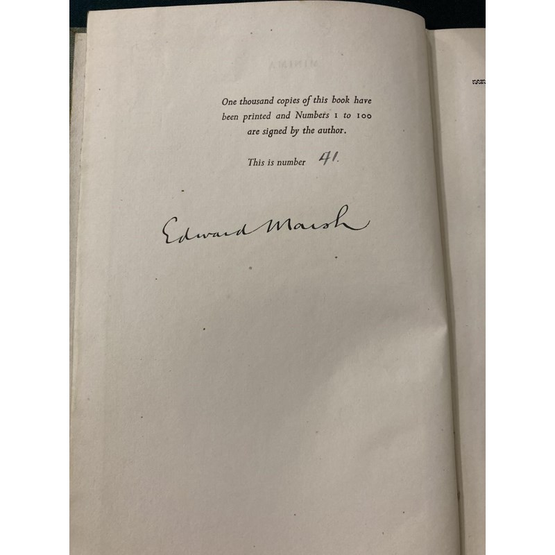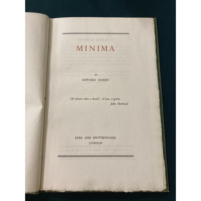 Eliot, T.S. Dante, number 67 of 125 signed copies, original cloth, faded, London: Faber & Faber, 1929; Marsh, Edward. Minima, number 41 of 100 signed copies, original cloth gilt uncut, London: Eyre and Spottiswoode, 1947; De la Mare, Walter. O Lovely England and Other Poems, original cloth, dust-jacket with nicks, inscribed on front flyleaf, "To Vere with love from W.J. Christmas 1953" [possibly W. J. Turner], London: Faber & Faber, 1953, 8vo (3) W. J. Turner (1884-1946), poet and music critic, friend of Siegfried Sassoon.