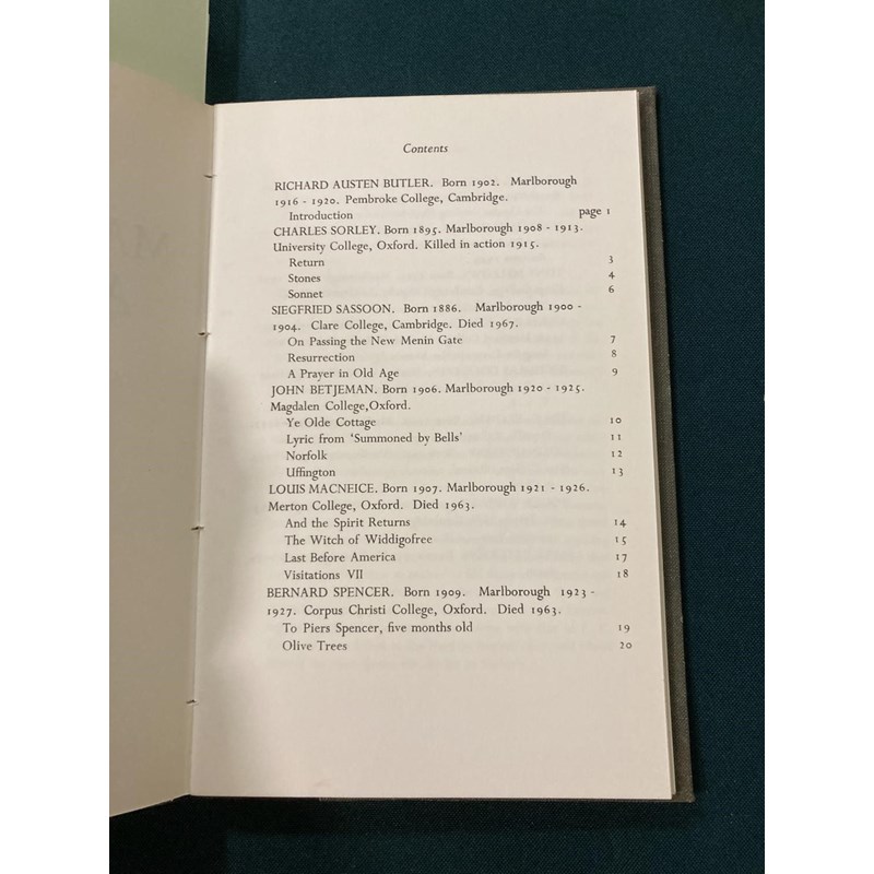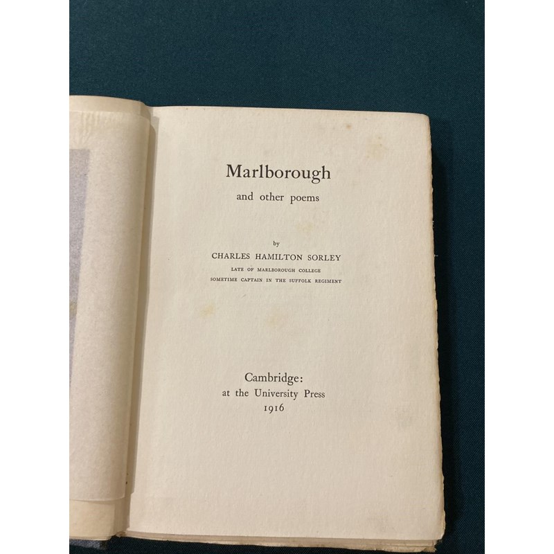Sorley, Charles Hamilton. Marlborough and other poems, first edition, photographic portrait frontispiece, 4pp. printed leaflet loosely inserted, "Lines Written Before Leaving England" comprising Sorley's poems Expectans Expectavi and Two Sonnets Written in France, original cloth, bookplate of The Old Oxyard Oare Wiltshire, 8vo, Cambridge: at the University Press, 1916; [-] The Marlborough Anthology by poets educated at Marlborough College 1912-1969, number 76 of 440 copies, quarter leather, 8vo, Marlborough: College Press, 1972 (2)