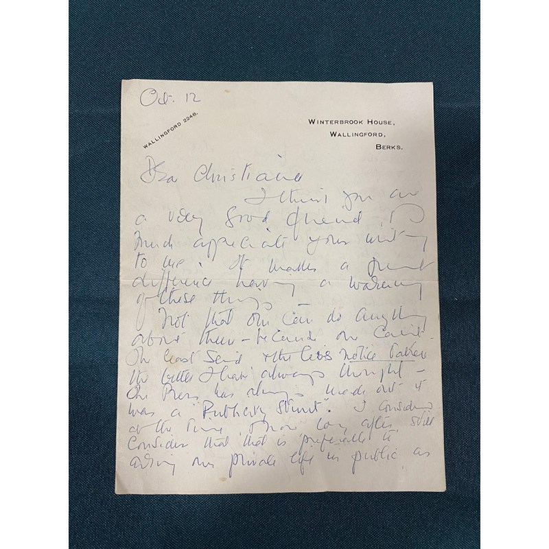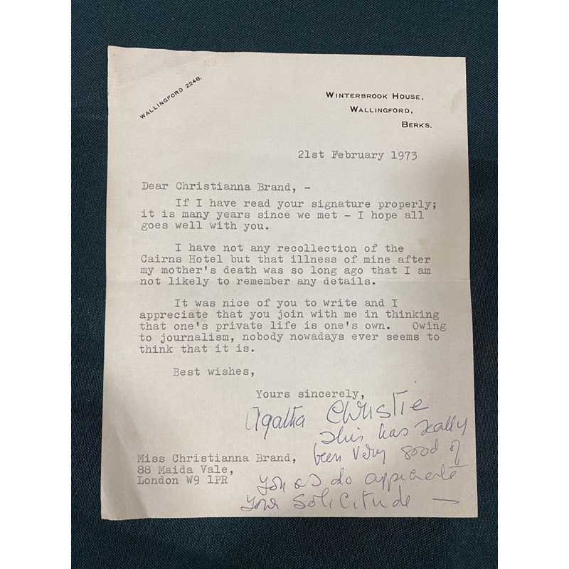 Christie, Agatha. Two autographed letters to Christianna Brand, 1) typed and signed, '...it is many years since we met - I hope goes well with you' and discussing privacy, '...I appreciate that you join me in thinking that one's private life is one's own. Owing to journalism, nobody nowadays ever seems to think that it is., 1pp., on headed paper and dated '21st February 1973'; 2) autograph letter signed, commencing 'Dear Christianna, I think you are a very good friend. I much appreciate your writing to me' and discussing privacy and writing, 2pp. folded, dated 'Oct 12' (2)