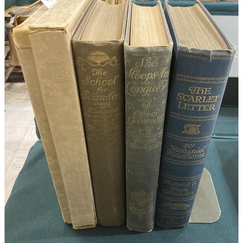 Thomson, Hugh, illustrator. Quality Street, first edition, tipped-n coloured plates, tissue guards, original cloth gilt, in original publisher's box, a.f., 4to, London: Hodder and Stoughton, [n.d.]; The Scarlet Letter, 4to, London: Methuen and Co., 1920; She Stoops to Conquer, 4to, Hodder and Stoughton, [n.d.]; The School for Scandal, 4to, London: Hodder and Stoughton, [n.d.], all with tipped-in plates, tissue guards, original cloth gilt, 4to (4)