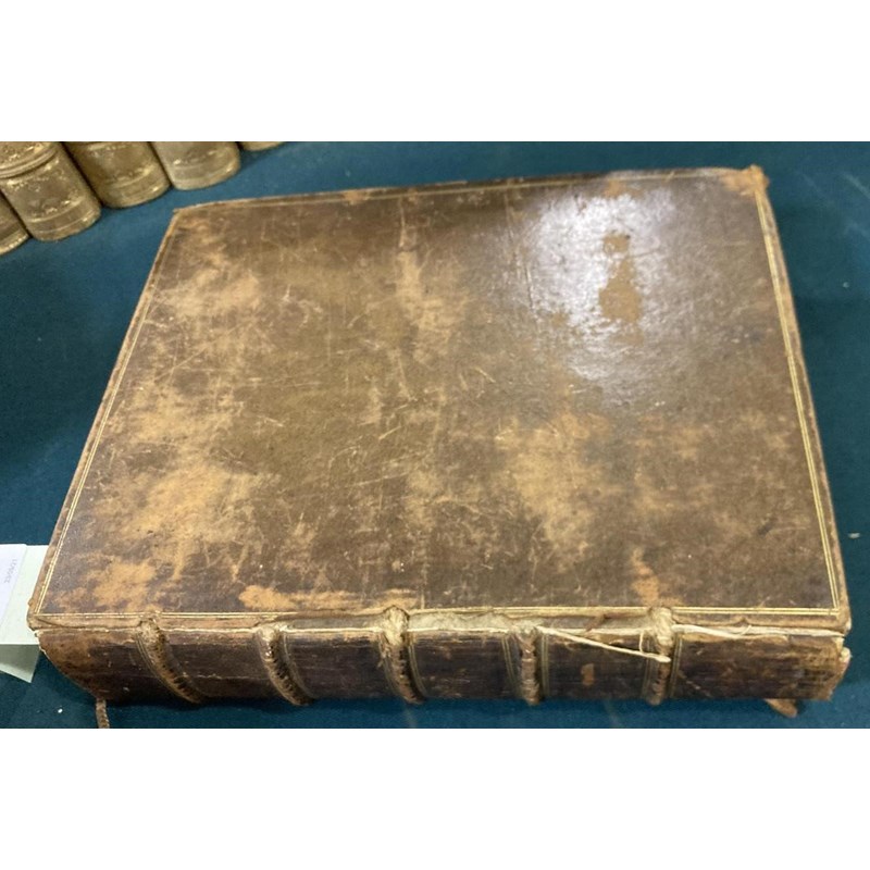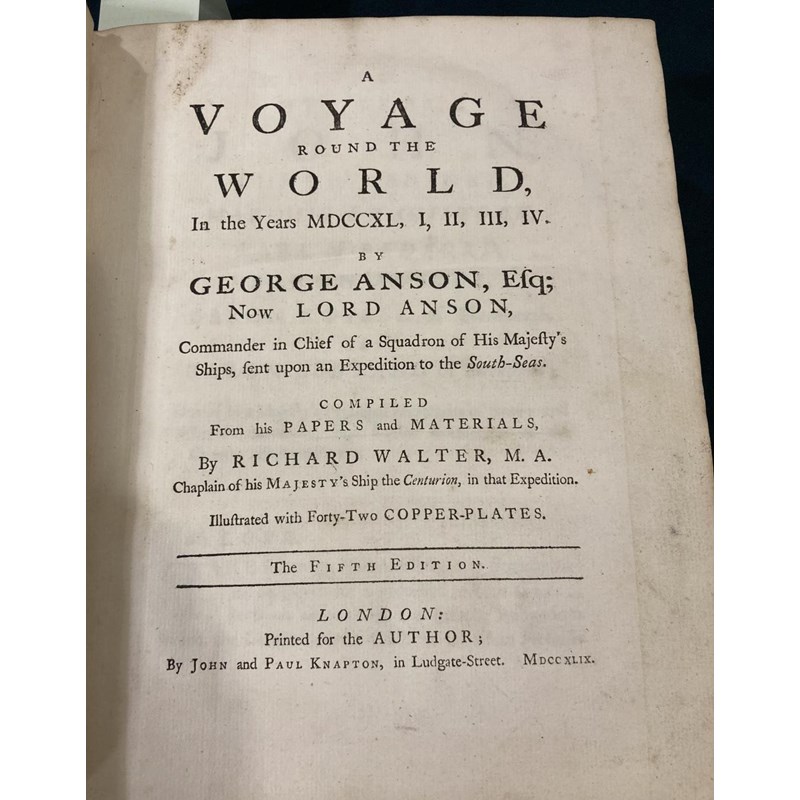 Anson, George. A Voyage Round the World, In the Years MDCCXL, I, II, II, IV, fifth edition, 42 engraved plates and maps, including folding engraved map frontispiece and 3 large folding charts, occasional light browning, contemporary calf gilt, joints cracked, extremities rubbed, 4to, London: For the Author, 1749