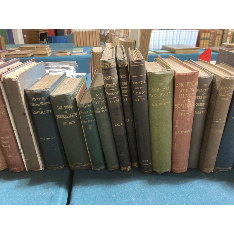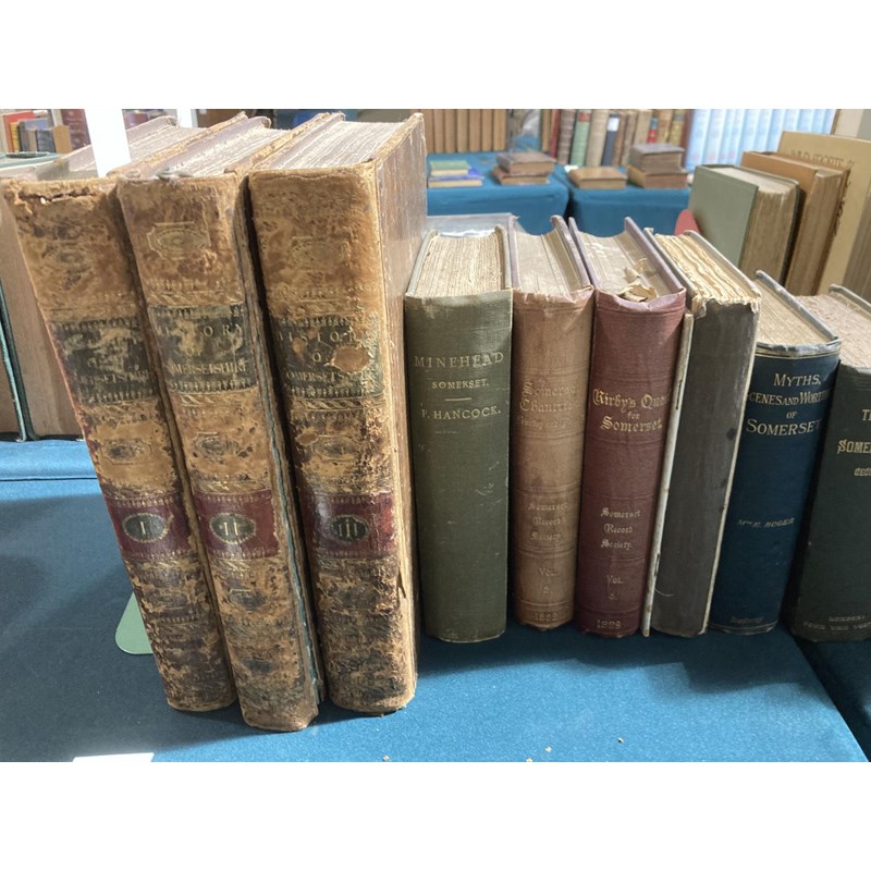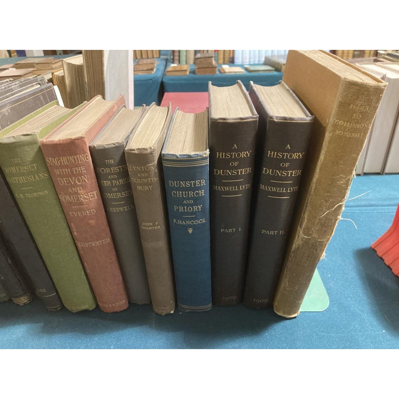 Collinson, John. The History and Antiquities of the County of Somerset, 3 volumes, first edition, engraved plates, without folding engraved map, contemporary calf, worn, covers detached, 4to, Bath: R. Cruttwell, 1791; Lyte, H. C. Maxwell. A History of Dunster, 2 volumes, plates, illustrations, original cloth gilt, 8vo, London: St. Catherine Press, 1909; Hancock, F. Minehead in the County of Somerset, number 137 of 250 copies, plates, original cloth, 8vo, Taunton: Barnicott and Pearce, 1903; and 18 others, Somerset, sold w.a.f., v.s. (24)