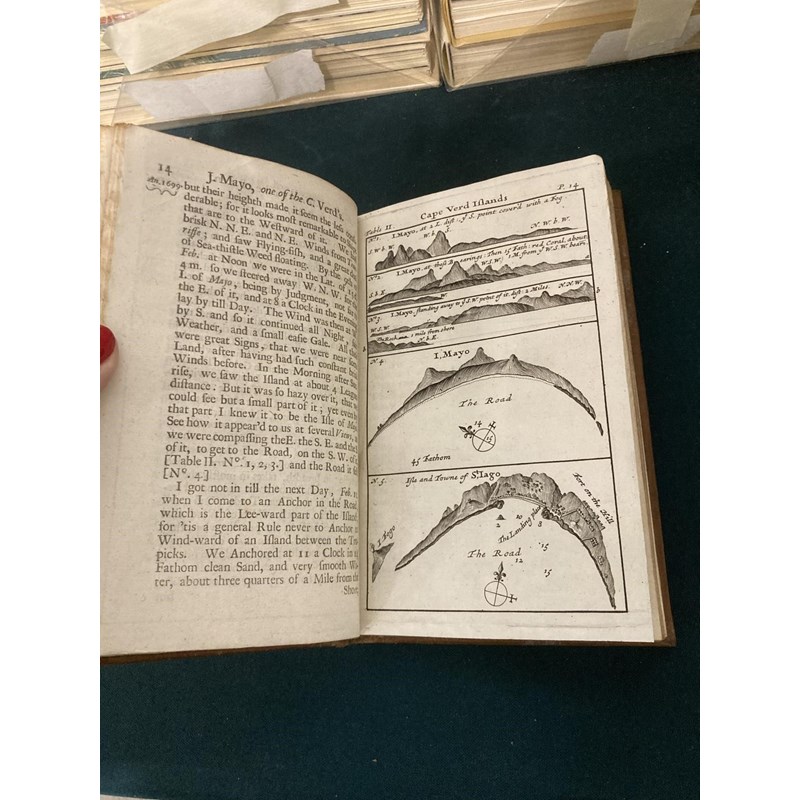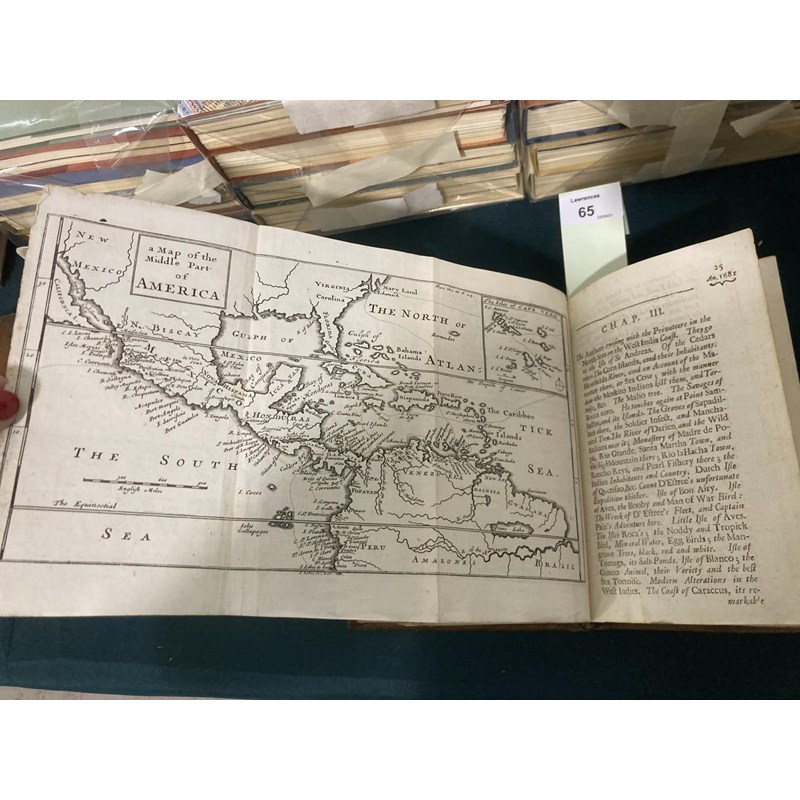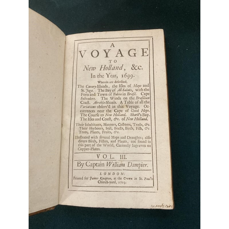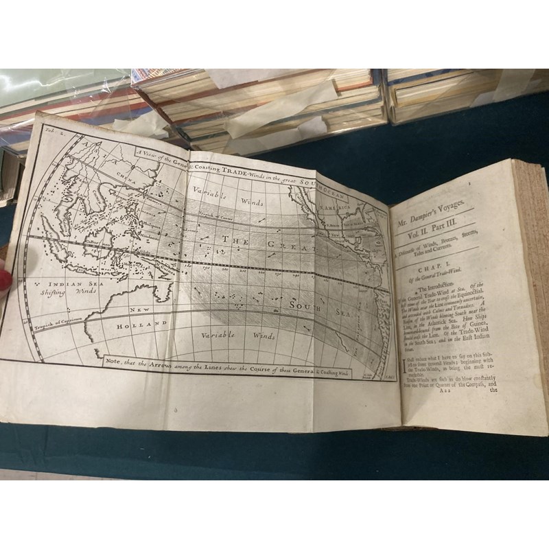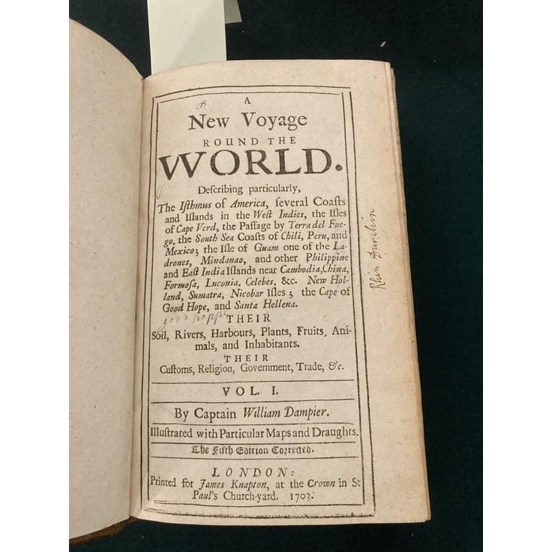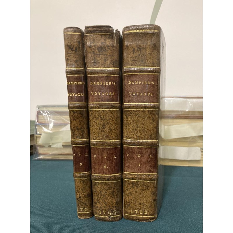 Dampier, William. A New Voyage Round the World, volumes 1-3 only, volume one, fifth edition, volume two, second edition, volume three, first edition, 20 engraved plates and maps, including 8 folding, 4pp. catalogue at the end of volume 1, contemporary panelled calf, volume two with neat repairs, but some worming to foot of spine, bookplate of Merthyr Guest, 8vo, London: James Knapton, 1703-1700-1703