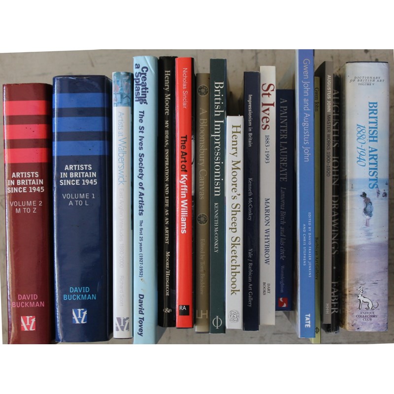 to include `Creating a Splash` by David Tovey, `Artists at Walberswick` by Richard Scott, `Henry Moore` by Moore and John Hedgecoe, `The Art of Kyffin Williams` by Nicholas Sinclair & Rian Evans, `A Bloomsbury Canvas` by Tony Bradshaw, `Artists in Britain since 1945` by David Buckman, 2 vols; and assorted volumes on British Impressionism, St Ives Colony, Lamorna Birch, Gwen John and Augustus John etc. (17 vols)