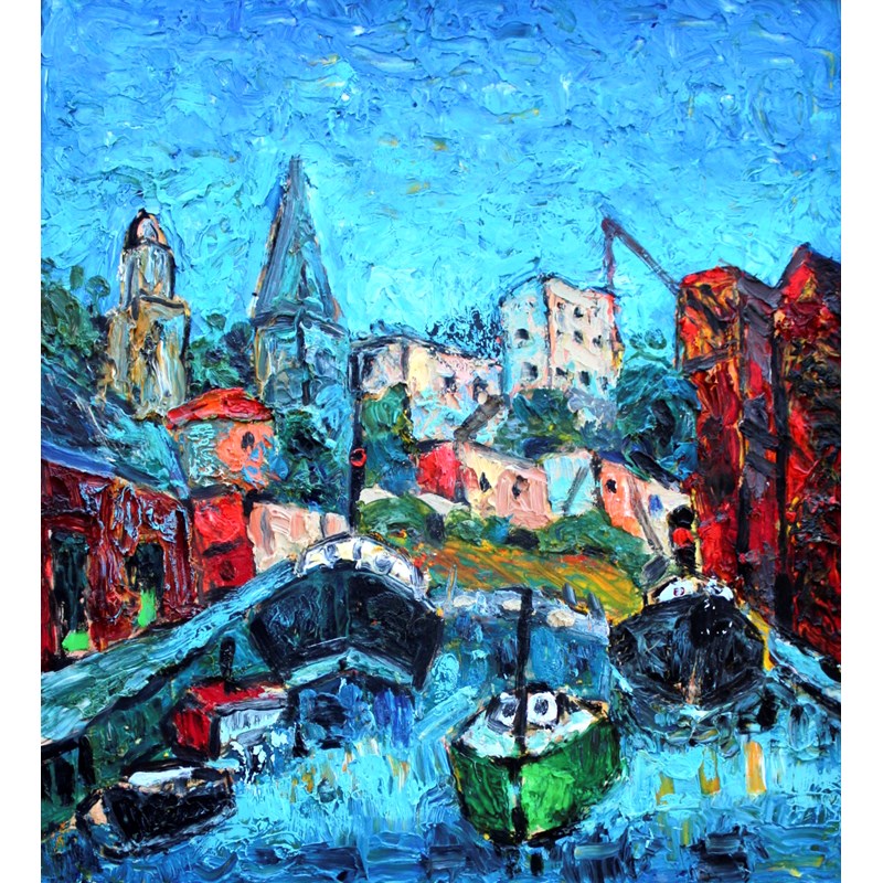 ‡BARRINGTON MOORE TABB (b.1934) BOATS, BRISTOL BRIDGE Signed and inscribed with title verso, oil on board 42.5 x 38cm.; with a copy Jonathan Benington's book `Passion for Paint: The Life and Work of Barrington Tabb` (Bristol, 2006) (2) Provenance: The artist's studio; Birmingham, Rob Whittle Fine Art, April 2005