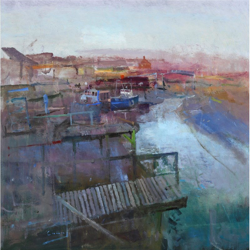 ‡FRED CUMING, RA (b.1930) RYE HARBOUR, EVENING AT LOW TIDE Signed, oil on Masonite 59.5 x 59.5cm. Provenance: Burford, Brian Sinfield, 2006, with a catalogue of `The New English Tradition` show from which this picture was purchased (illus. p.15) (2)