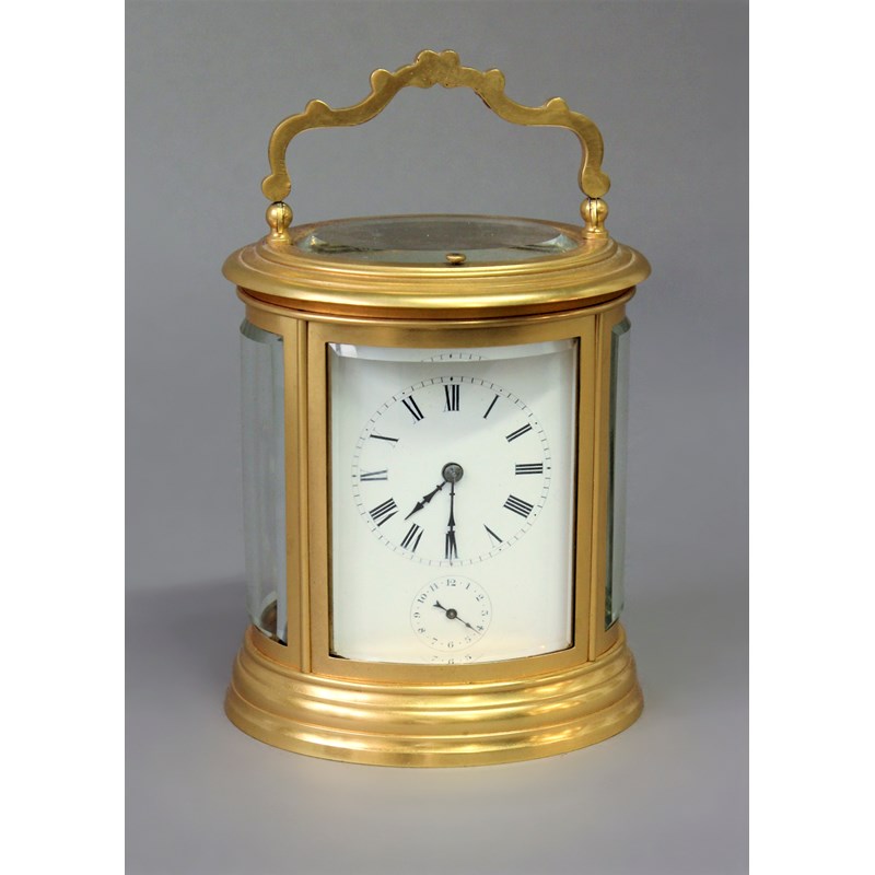 FRENCH GILT METAL OVAL CARRIAGE CLOCK late 19th century, the enamelled dial with Roman numerals above a subsidiary alarm dial on a brass, eight day, repeating movement striking half hourly to a gong, the case with repeater button and scrolling handle, with key and its original leather lined case, height excluding handle 14cm
