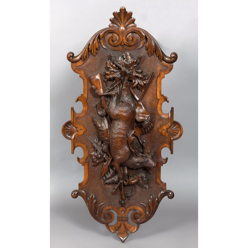 LARGE BLACK FOREST PLAQUE probably by Fluck, carved with a deer hanging before a rifle, spears, hunting horn and open back, between a scrolling crest and foot, height 110cm