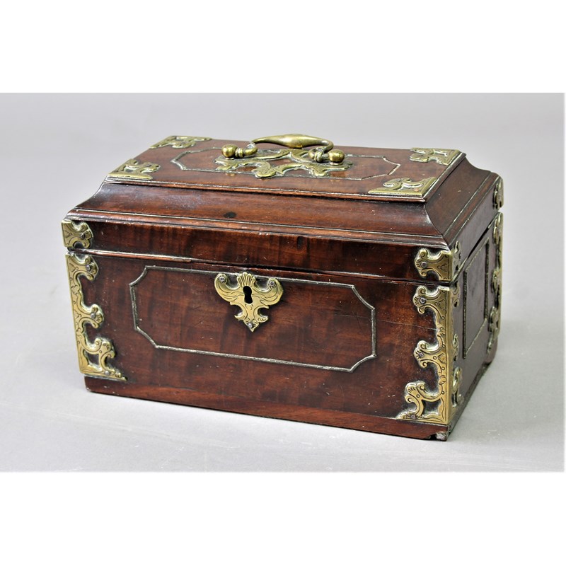 GEORGIAN MAHOGANY AND BRASS MOUNTED TEA CADDY with panelled sides and vacant interior, height 15.5cm, width 25.5cm, depth 14cm