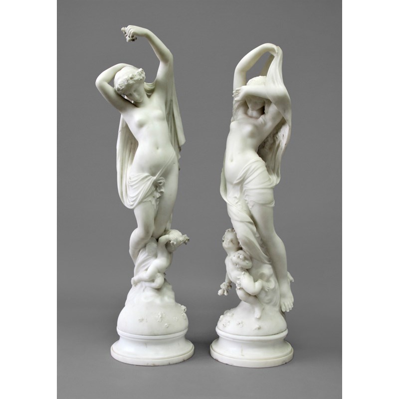 PAIR OF WHITE MARBLE FIGURES 20th century, of scantilly clad maidens and cherubs on domed bases, height 86cm (2)
