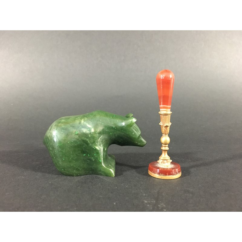 INUIT GREEN JADE BEAR 20th century, inscribed, length 7cm; together with a gilt metal and banded agate seal (2)