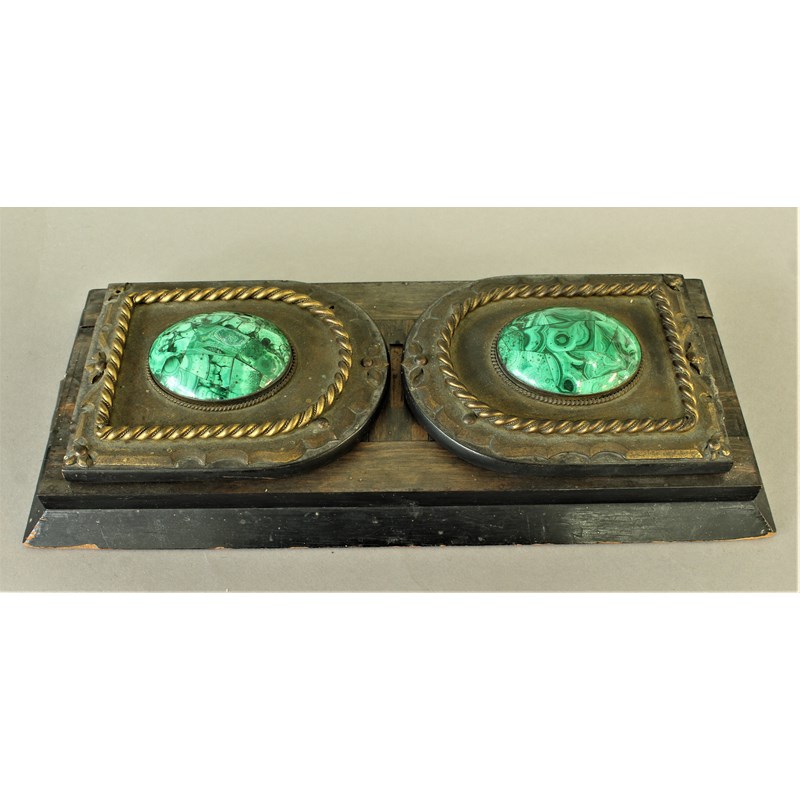 VICTORIAN COROMANDEL, BRASS AND MALACHITE MOUNTED BOOKSLIDE the arched ends with large oval cabachons, stamped Patent 4984, length closed 33cm