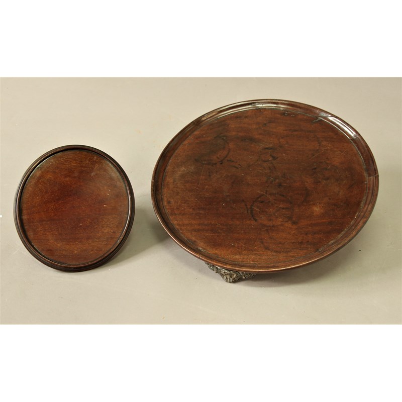 on four white metal, shell feet, diameter 25cm; together with a mahogany, circular tray or stand, diameter 24.5cm (2)