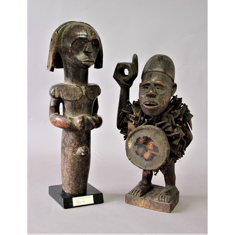 Fang Beiri male reliquary figure, Gabon, carved wood and brass, height excluding stand 47cm; together with a Nkondi Power Figure, Congo, inset with with nails, metal shards, glass lense and other items, height 43cm (2)