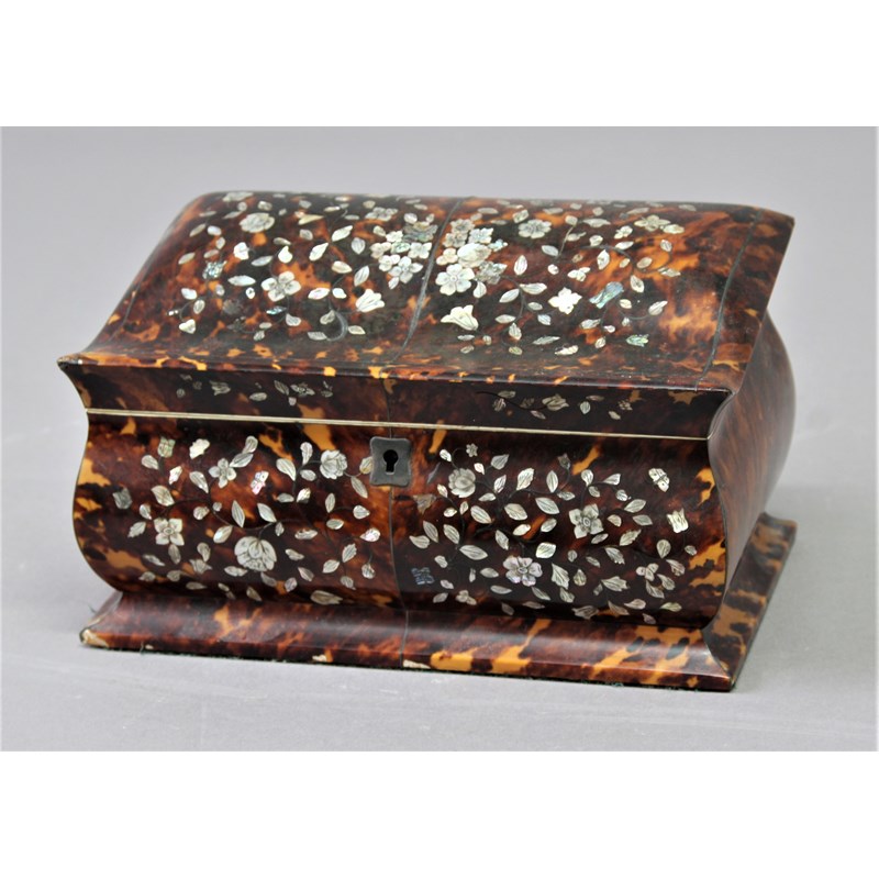 VICTORIAN TORTOISESHELL AND MOTHER OF PEARL INLAID TEA CADDY of bombe form, with a rounded top and sides, inlaid with floral sprays, height 13cm, width 23cm, depth 14cm