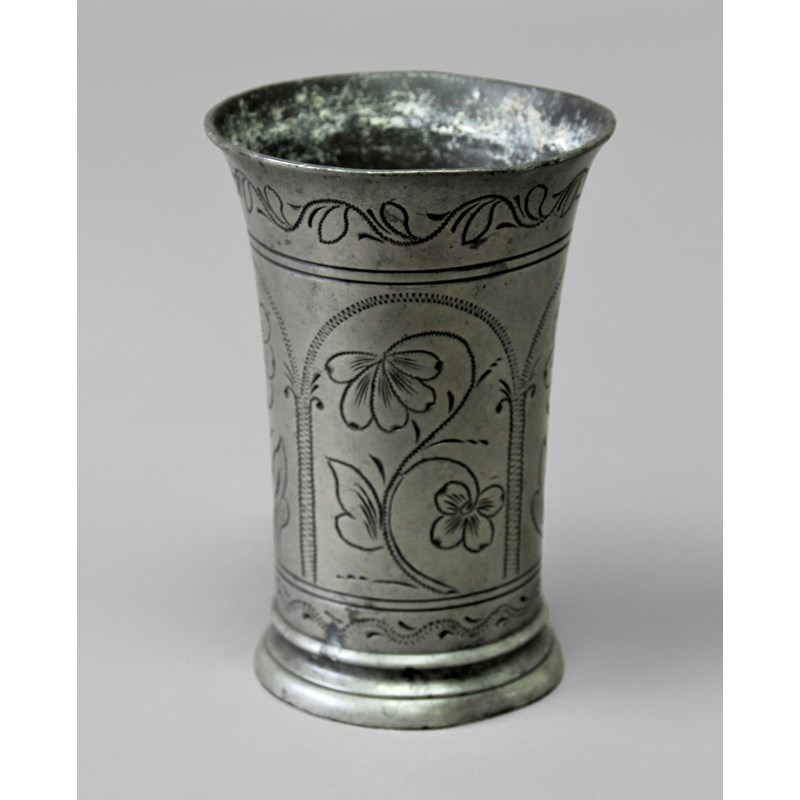 DUTCH PEWTER WRIGGLEWORK BEAKER probably circa 1700, of slightly flared form, with floral decoration, crowned rose touchmark, height 14cm