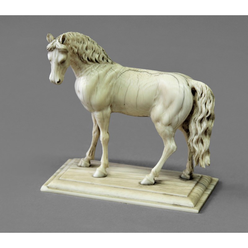 IVORY STUDY OF A HORSE probably Dieppe, standing looking to the left, on a rectangular base, height 10cm, width 10cm