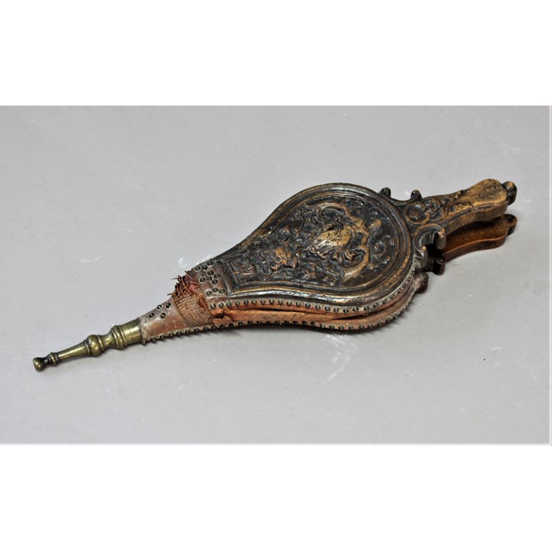 SET OF WALNUT AND LEATHER BELLOWS 19th century, carved with a classical maiden amongst scrolling foliage, length 55cm