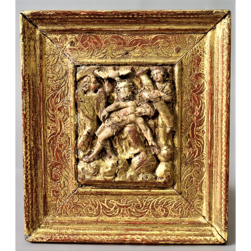 MALINES CARVED AND PARCEL GILT ALABASTER PLAQUE depicting the Trinity, probably 17th century, plaque 11.5cm x 9.5cm, with frame 22.5cm x 20cm