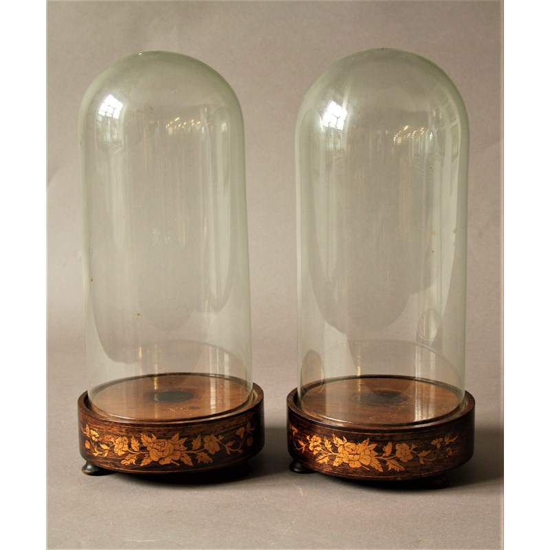 PAIR OF VICTORIAN GLASS DOMES the bases with boxwood floral inlay, for taxidermy or figures, height 41cm (2)