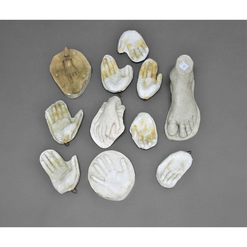 mainly right hands, some named and dated 1927, length 21cm and smaller; together with a plaster casting of a foot, possibly from a Roman original, length 34cm (11)