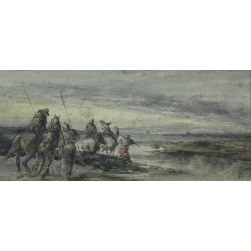 GEORGE CATTERMOLE (1800-1868) A SCENE IN THE CIVIL WAR: CROMWELL'S MEN Signed with monogram and dated 1856, watercolour 12.5 x 28.5cm.
