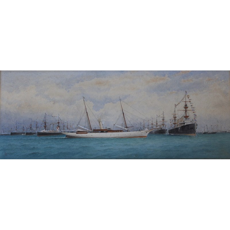 O** T** PRITCHETT (Fl.c.1897) SANTA MARIA R.Y.S., LORD LLANGATTOCK Signed and dated JUNE 26th 1897; also signed, inscribed with title and further inscribed Architect of Swindon Wilts/ June 26 1897/ Note the Royal yacht above his signature verso and upon a label on the backpaper, watercolour heightened with touches of bodycolour 21.5 x 54.5cm.