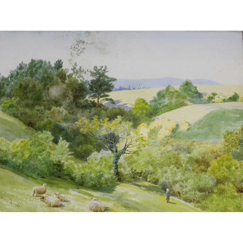 SHEEP AND A COUNTRY GIRL IN A SUMMER LANDSCAPE