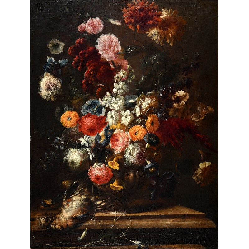 ATTRIBUTED TO FRANZ WERNER VON TAMM (1658-1724) STILL LIFE OF FLOWERS IN AN URN, WITH A DEAD BIRD Oil on canvas, laid on masonite 92 x 70cm.
