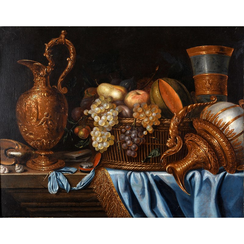 STILL LIFE OF EWERS WITH SHELLS, A POCKET WATCH AND A BASKET OF FRUIT UPON A DRAPED LEDGE