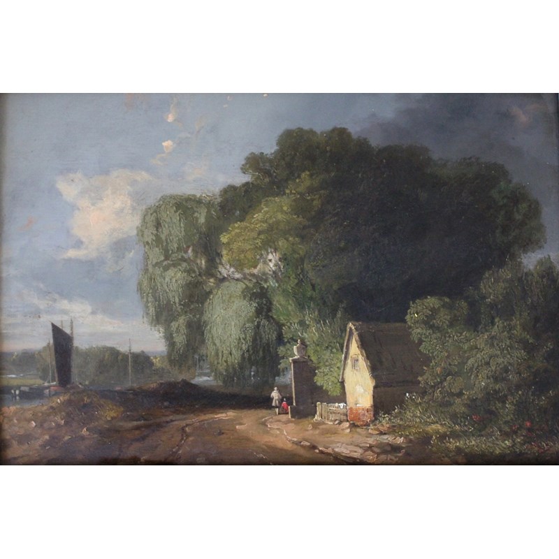 CIRCLE OF JOHN SELL COTMAN (1782-1842) FIGURES BY A COTTAGE ON A RIVERSIDE LANE Bears traces of a signature, oil on panel 32 x 47cm.